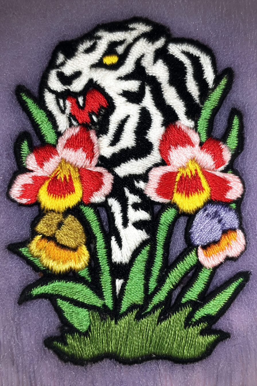 This work belongs to a series of embroidered paintings inspired by the universe of electric tattooing, which to me is one of the strongest and most contemporary artistic languages we have today. This specific piece is a personal tribute to Mino Luchena — in my eyes the best tattoo artist not only in Italy, but globally. I’m lucky to know him, and even luckier to carry part of his work on my skin.The original iconography comes from a classic motif revisited by many tattoo artists over time: a tiger resting above skulls, surrounded by lush flora. Here the image mutates into another medium — embroidery — while keeping the same sacred energy.